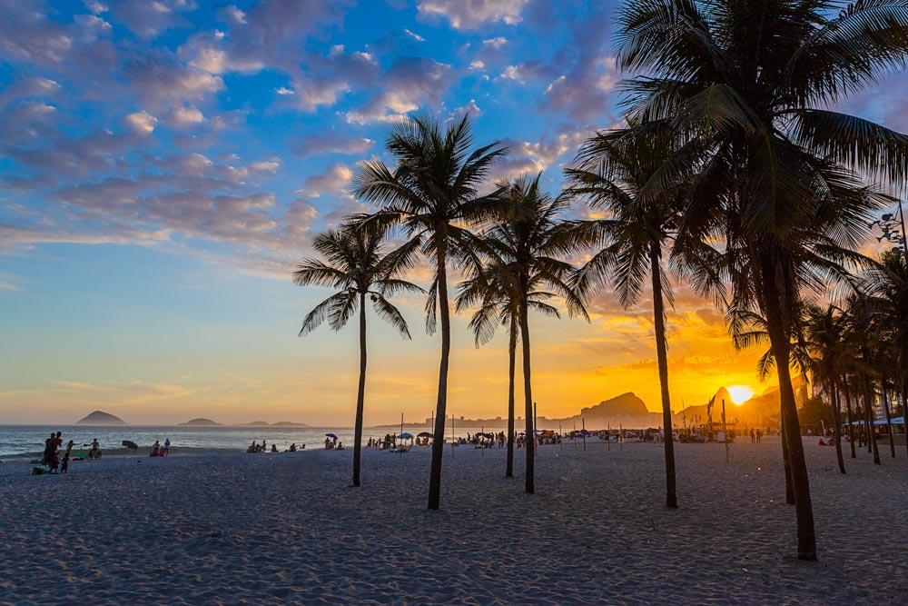 Esse é o céu de verão no Rio de Janeiro com cores vibrantes. Um belo final de tarde com os coqueiros compondo essa bela imagem na praia do Leme.