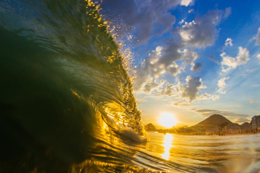 Onda em Copacabana sendo contrastada com um lindo céu azul e cores vibrantes do verão.